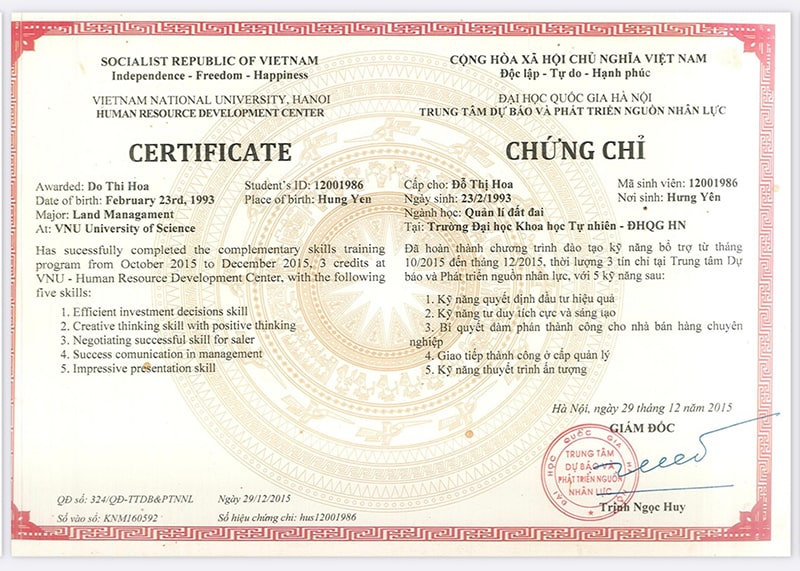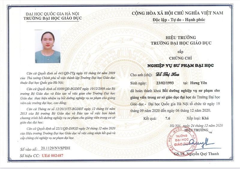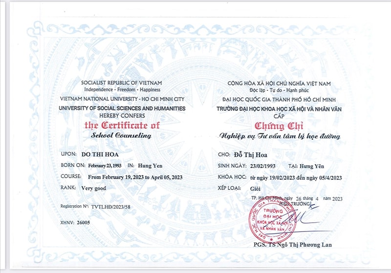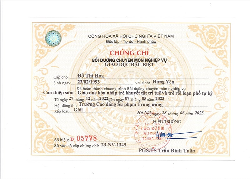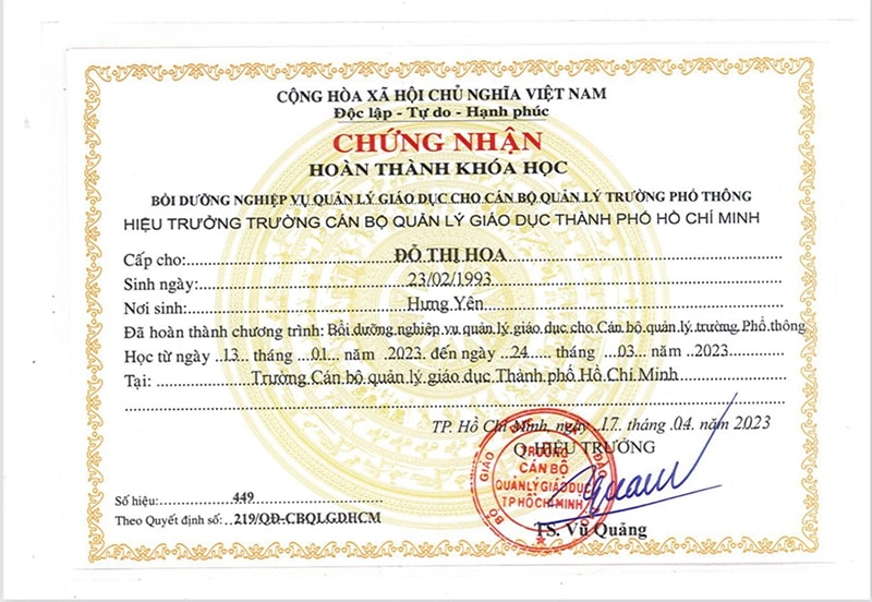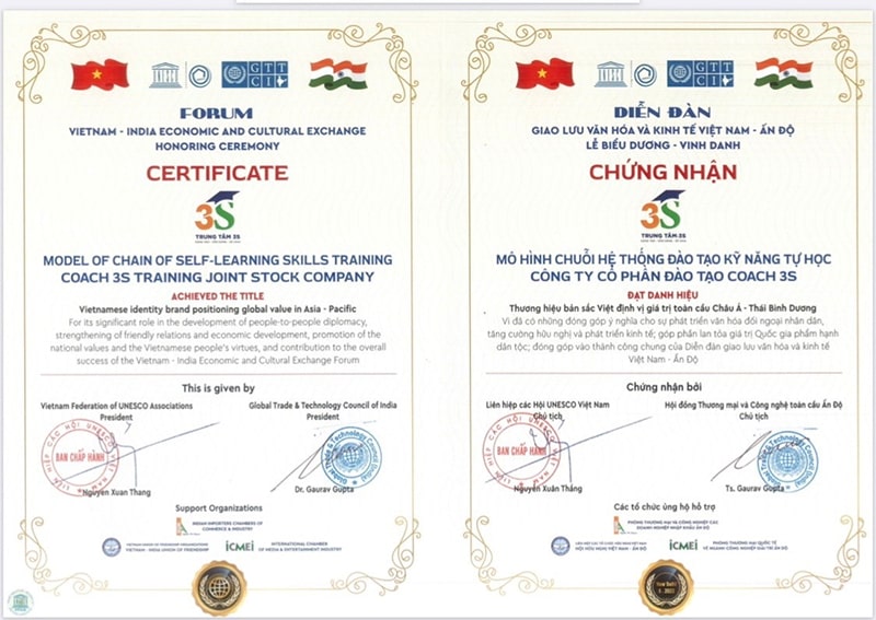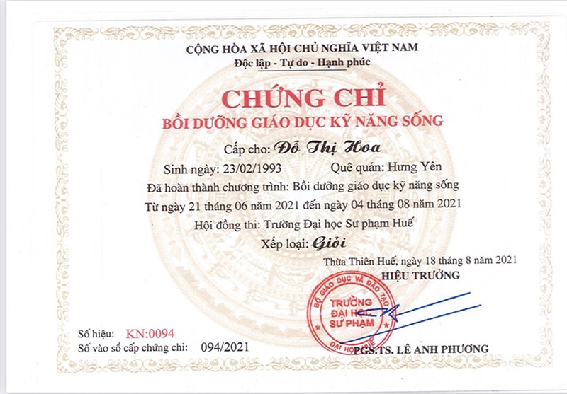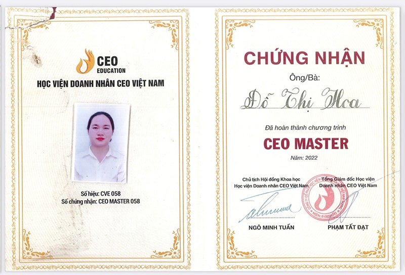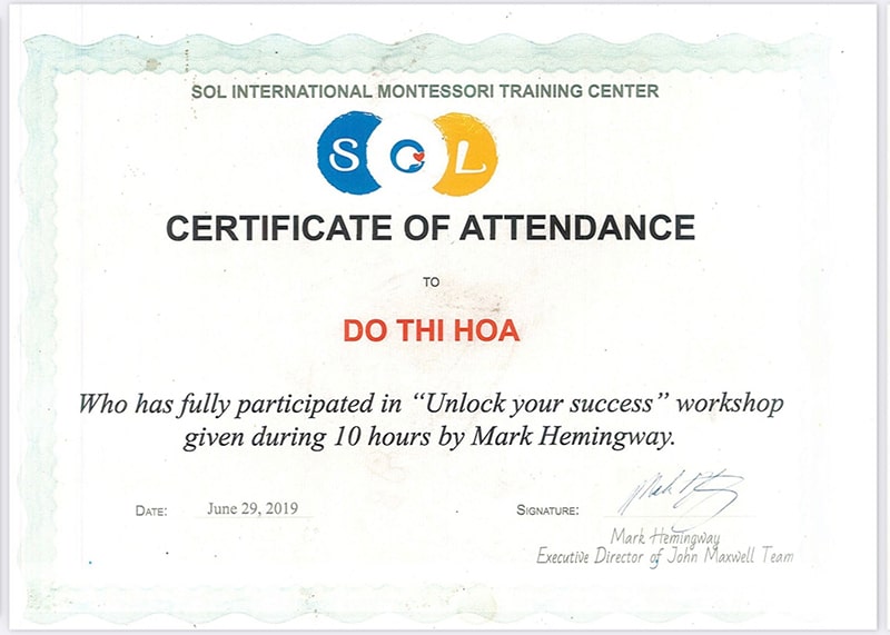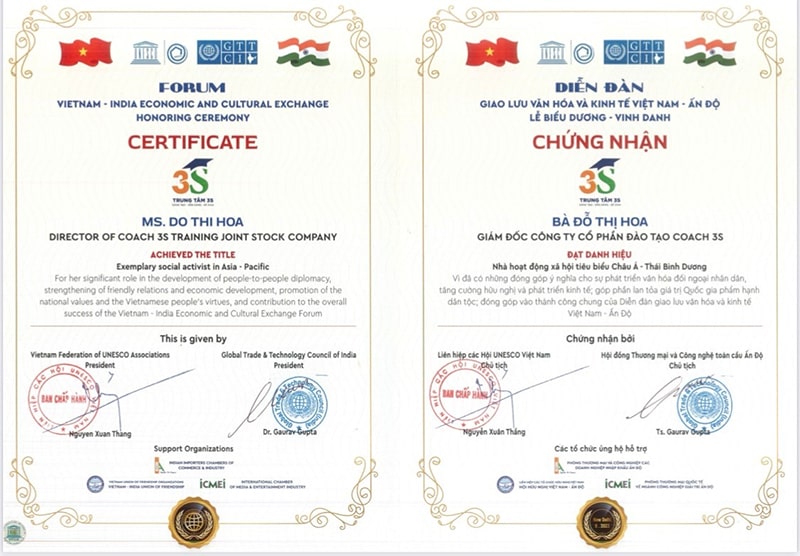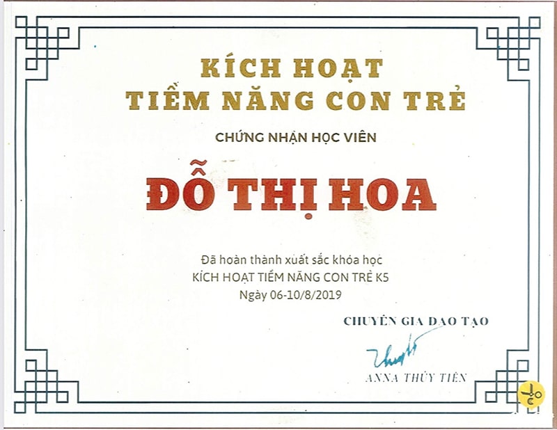 - Là thành viên Liên hiệp các hội UNESCO VIET NAM được vinh danh hạng mục Nhà hoạt động xã hội tiêu biểu Châu Á Thái Bình Dương - Được cấp bằng Nghiệp vụ Sư phạm, Tâm lý, Kỹ năng sống, Giáo dục trẻ đặc biệt, Lập trình ngôn ngữ tư duy, Kích hoạt tiềm năng con trẻ, Phương pháp giáo dục Montessori, chuyên gia Sinh trắc vân tay, Master NLP, Master CEO, Tham vấn viên STVT của viện nghiên cứu STVT Việt Nam, ...